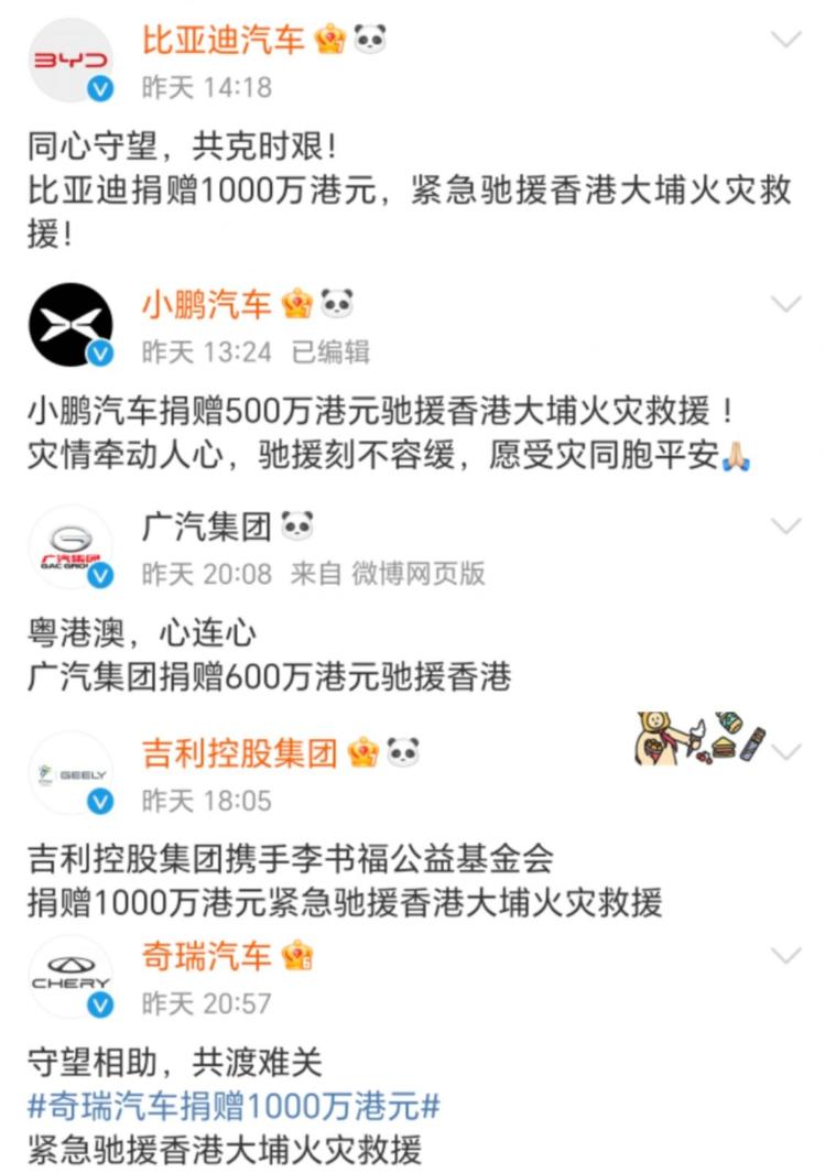海报新闻记者孙来宾11月27日报道,比亚迪汽车、小鹏汽车、广汽集团、吉利控股集团、奇瑞汽车等国内车企施工受影响居民。各车企发布捐赠公告 据各企业公告,比亚迪汽车宣布捐赠1000万港元,小鹏汽车捐赠500万港元,广汽集团捐赠600万港元,用于紧急居民、灾民的紧急医疗救助、临时安置和灾后家园重建;吉利控股集团与李书福慈善基金会合作,提供1000万港元,重点用于受灾群众的医疗救助、紧急安置和灾后重建。同时,姬氪品牌将在紧急情况下使用车辆用于各机构的部署;奇瑞汽车通过中国红十字基金会向俄罗斯捐赠1000万港元h 应急救援工作。此次火灾源于11月26日香港大埔宏福苑发生的五级火灾,造成重大人员伤亡和财产损失。火灾发生后,香港各界迅速展开救援行动,但受灾居民的临时安置、医疗救治和房屋重建仍需要大量资金支持。多家车企及时捐款,为灾区救援及后续恢复工作注入资金支持。 上一篇:巨资丨中国宏桥捐资3000万港元助力香港火灾救援
