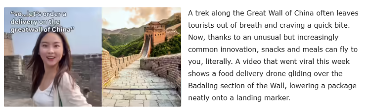 最近,一张外卖无人机在长城向游客运送食物的视频导致与许多外国媒体进行了激烈的讨论,讨论了中国经济发展局势的发展。